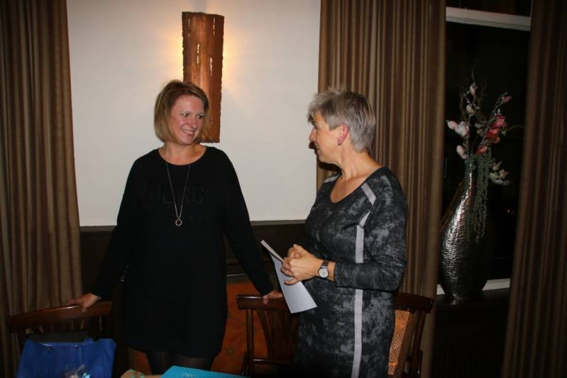 Hierna nam Gemma, onze voorzitter, het woord en na wat hoogtepunten te memoreren werd Astrid uiteraard bedankt voor haar inzet waardoor we staan waar we nu staan. Hierbij werd een bos bloemen en een cadeau namens het bestuur overhandigd.