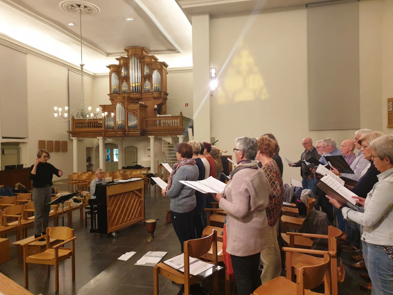 Vanwege het besluit om de kerk niet meer te verwarmen hebben we gezocht naar mogelijkheden om onze repetities wat aangenamer voort te kunnen zetten. Zodoende kwamen we in contact met de Hofkerk en het bleek mogelijk om daar te repeteren. We konden zelfs kiezen uit repeteren in de zaal of in de kerk. De zaal bleek nog aangenamer en we hebben met veel plezier gebruik gemaakt van deze mogelijkheid.